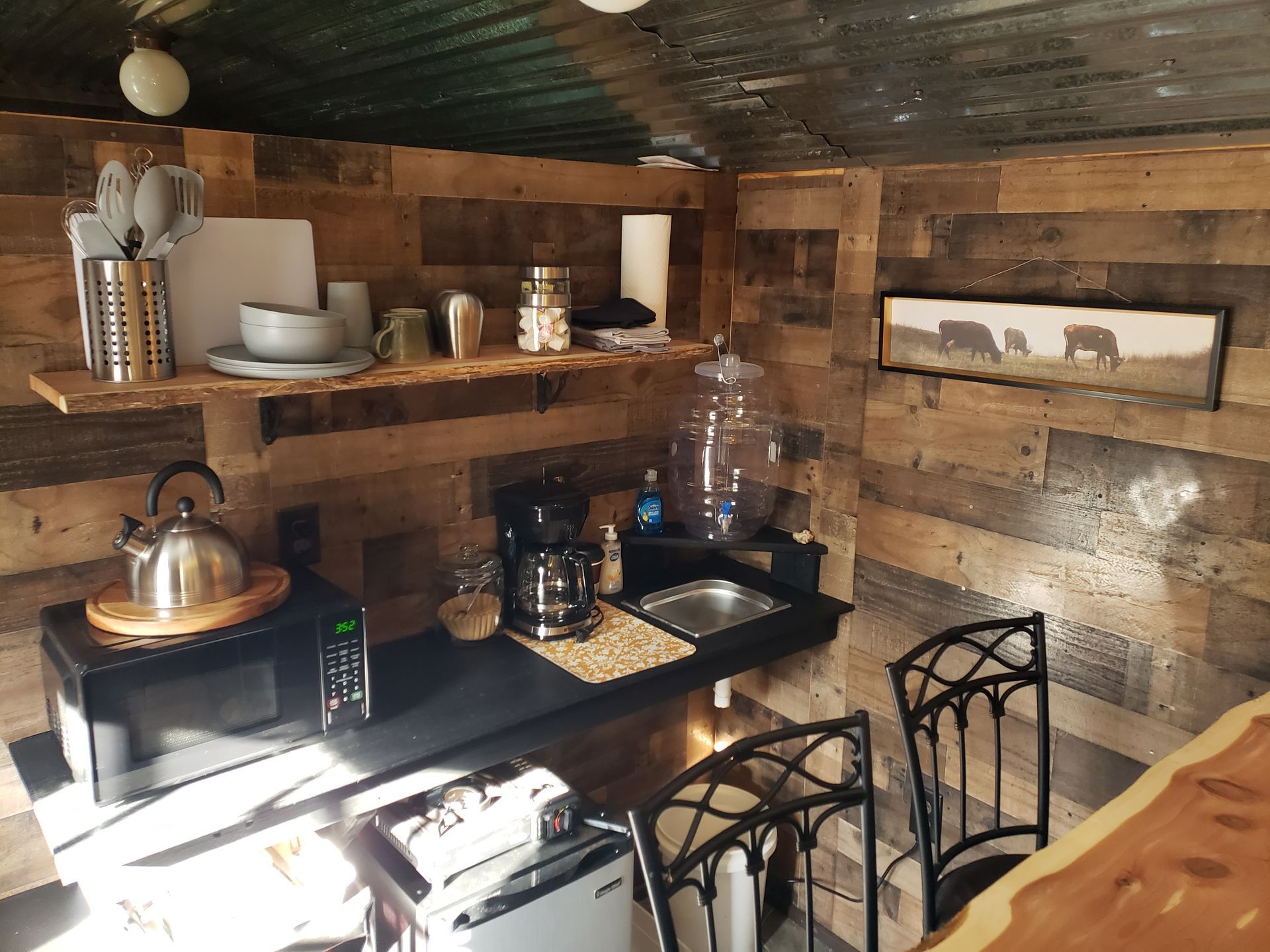 This completely off-grid tiny home has a full size bed with a sleeper love seat. Kitchenette is stocked with a Keurig coffee maker and coffee, microwave, mini-fridge, Coleman single burner cook stove, gravity fed sink, cookware, cutting board, utensils, grilling utensils, plates, bowls, drinkware, towels & linens, 4 Adirondack chairs, picnic table, charcoal grill, gravity fed sink, firepit, solar powered, A/C, heated. It has its own personal half bath and is only steps away from the bathhouse that has 2 private baths with hot showers. The river is accessible by trail or 4WD. This unit is isolated and is the best unit for dark sky stargazing.