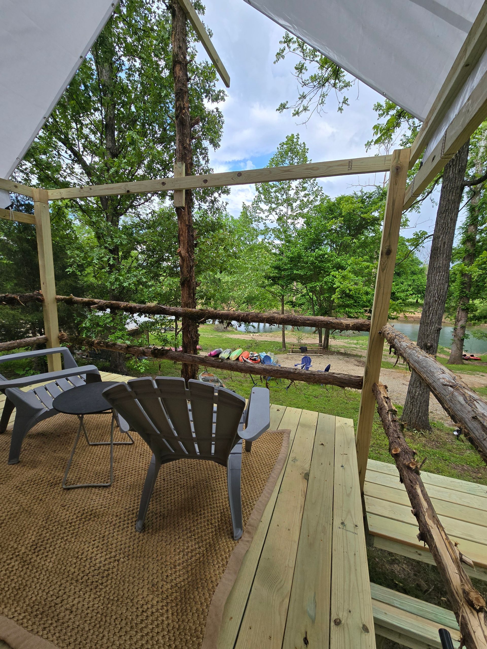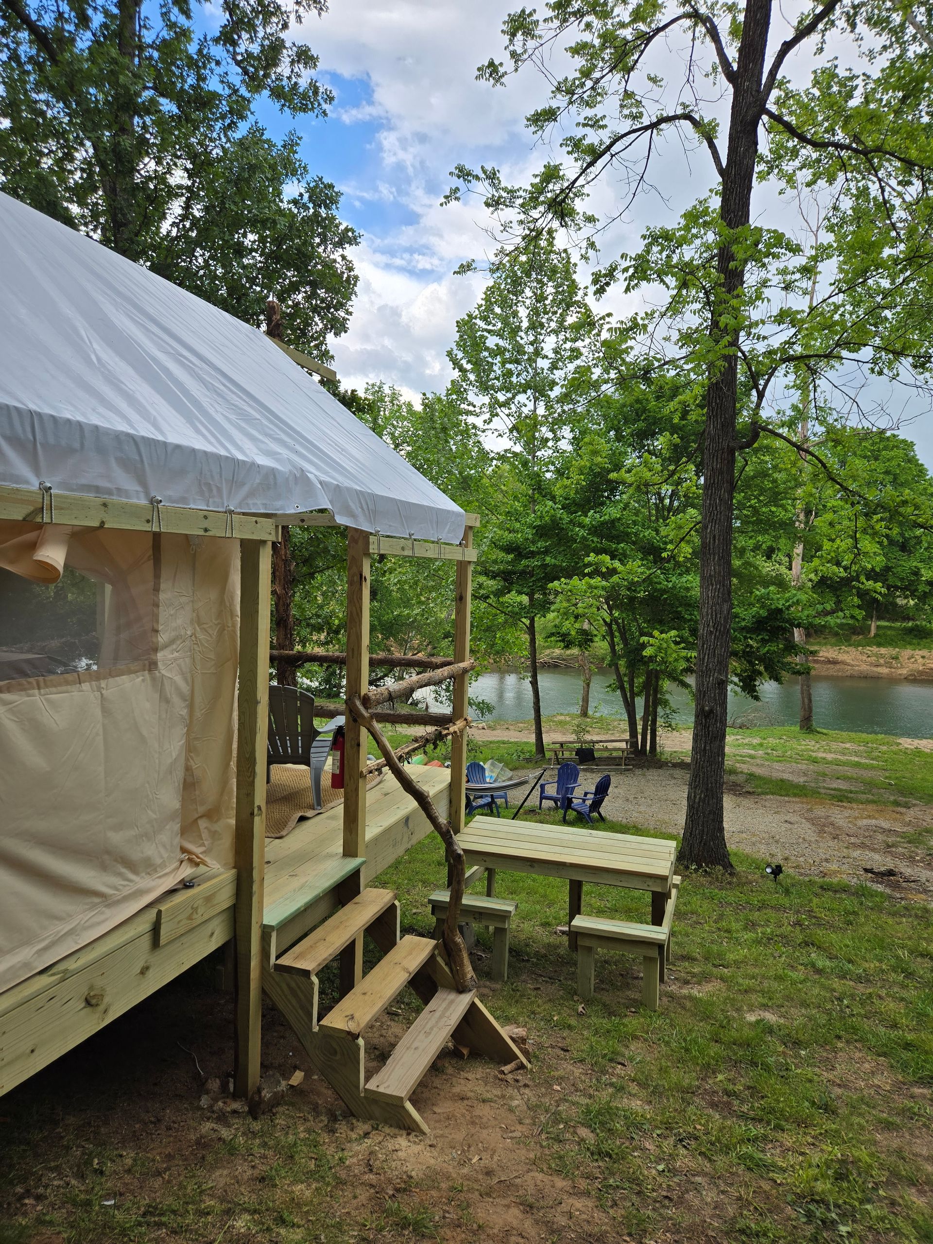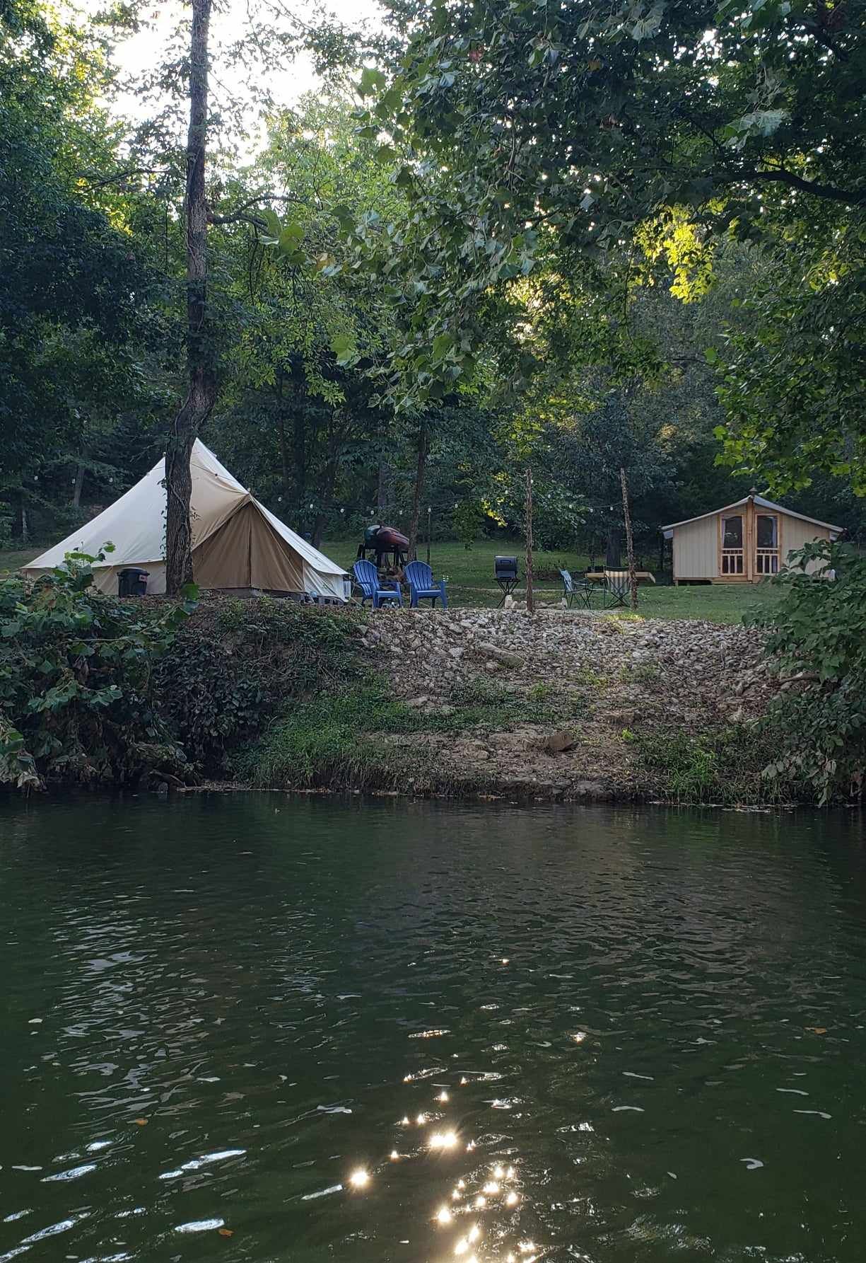 Cedar Ridge is a remote and intimate off-grid glamping experience. Located on nearly 20 acres of forested hillside with extensive riverfront on the South Fork Spring River. Immerse yourself in nature while also enjoying some creature comforts in one of our canvas bell tents or tiny homes that are fully furnished. Unwind on a front porch or kick back in a hammock and take a deep breath…..you can finally relax. All the fun of camping without the work or frustration. Take a hike down one of our nature trails, fish for smallmouth or perch, plan a kayak float trip on the South Fork Spring River, go for a swim, or enjoy some outdoor games on the lawn by the river.