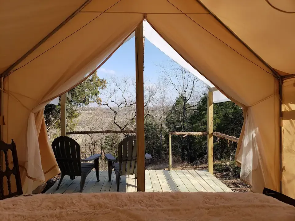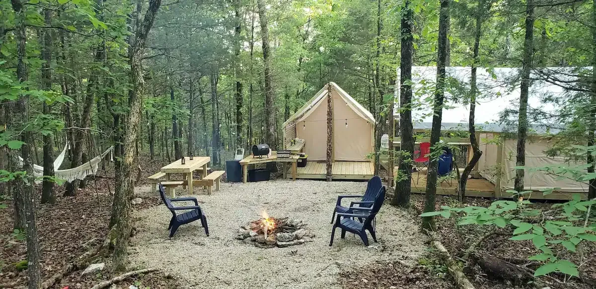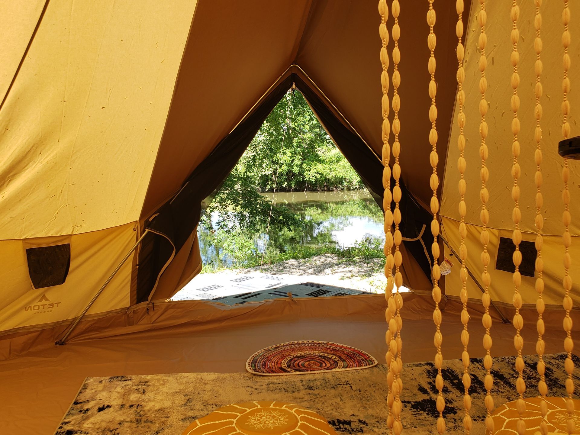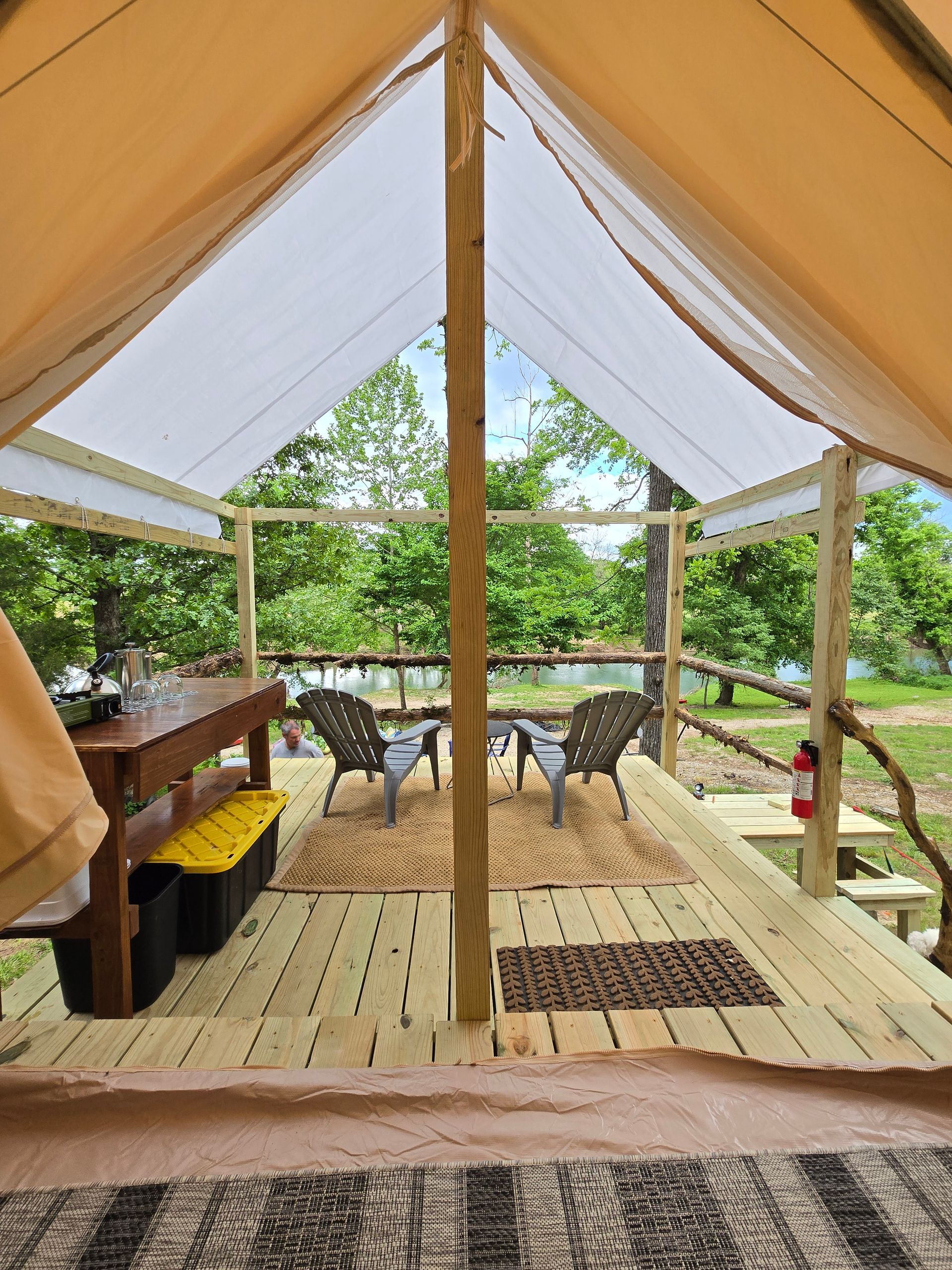Cedar Ridge is a remote and intimate off-grid glamping experience. Located on nearly 20 acres of forested hillside with extensive riverfront on the South Fork Spring River. Immerse yourself in nature while also enjoying some creature comforts in one of our canvas bell tents or tiny homes that are fully furnished. Unwind on a front porch or kick back in a hammock and take a deep breath…..you can finally relax. All the fun of camping without the work or frustration. Take a hike down one of our nature trails, fish for smallmouth or perch, plan a kayak float trip on the South Fork Spring River, go for a swim, or enjoy some outdoor games on the lawn by the river.