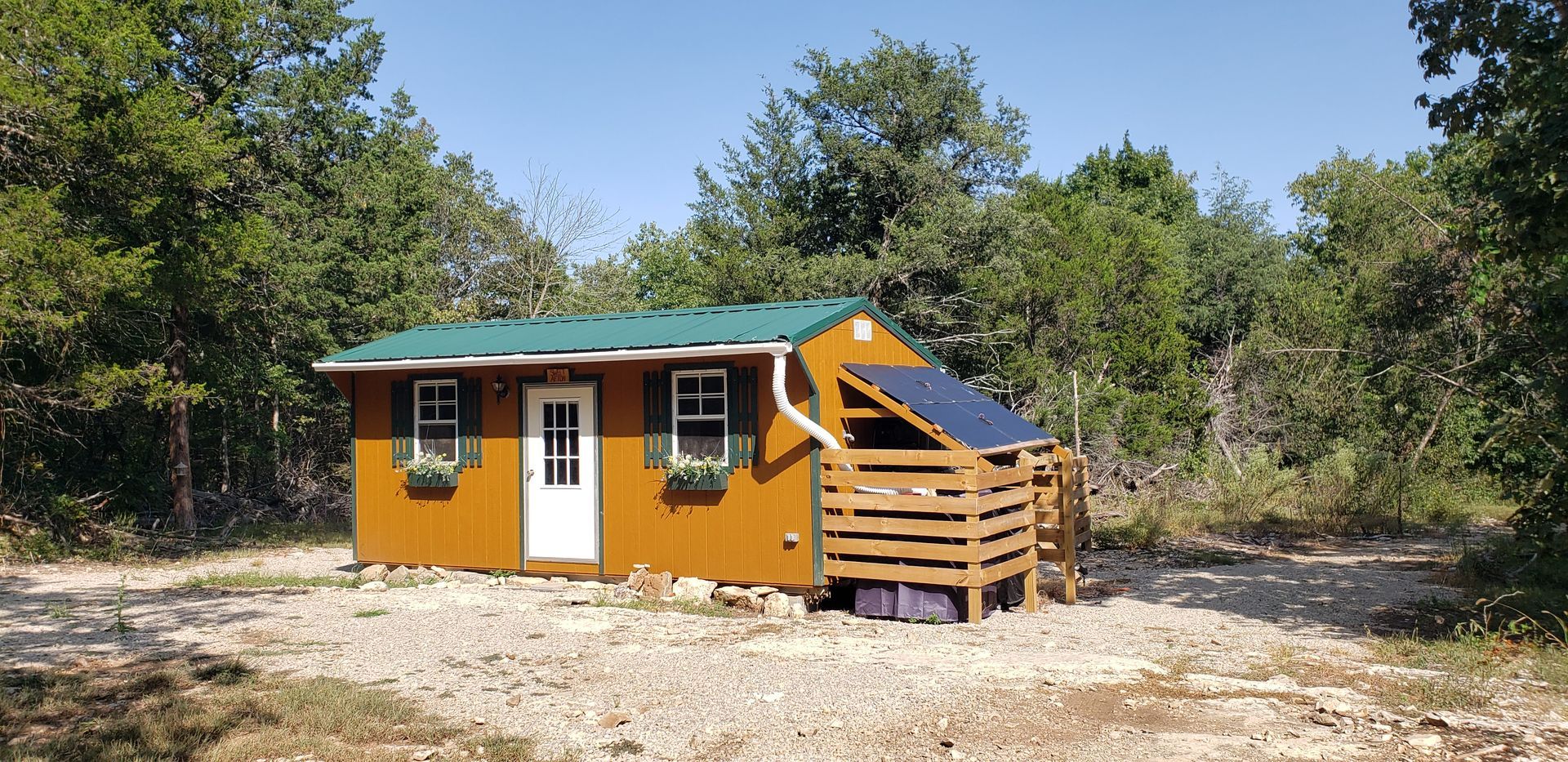 This completely off-grid tiny home equipped with its own solar power system has a queen futon with a queen bed in the loft. Kitchenette is stocked with a Keurig and coffee, microwave, mini-fridge, Coleman single burner cook stove, cookware, cutting board, utensils, grilling utensils, plates, bowls, drinkware, towels & linens, 4 Adirondack chairs, outdoor cooking area, charcoal grill, Blackstone, gravity fed water for washing, firepit, A/C, heated. Steps away from the bathhouse that includes 2 individual private baths with composting toilets and off-grid hot showers. Located on the South Fork Spring River with an amazing view.
