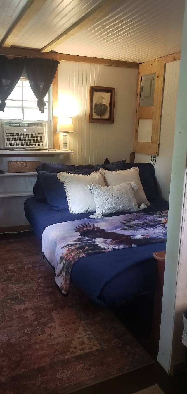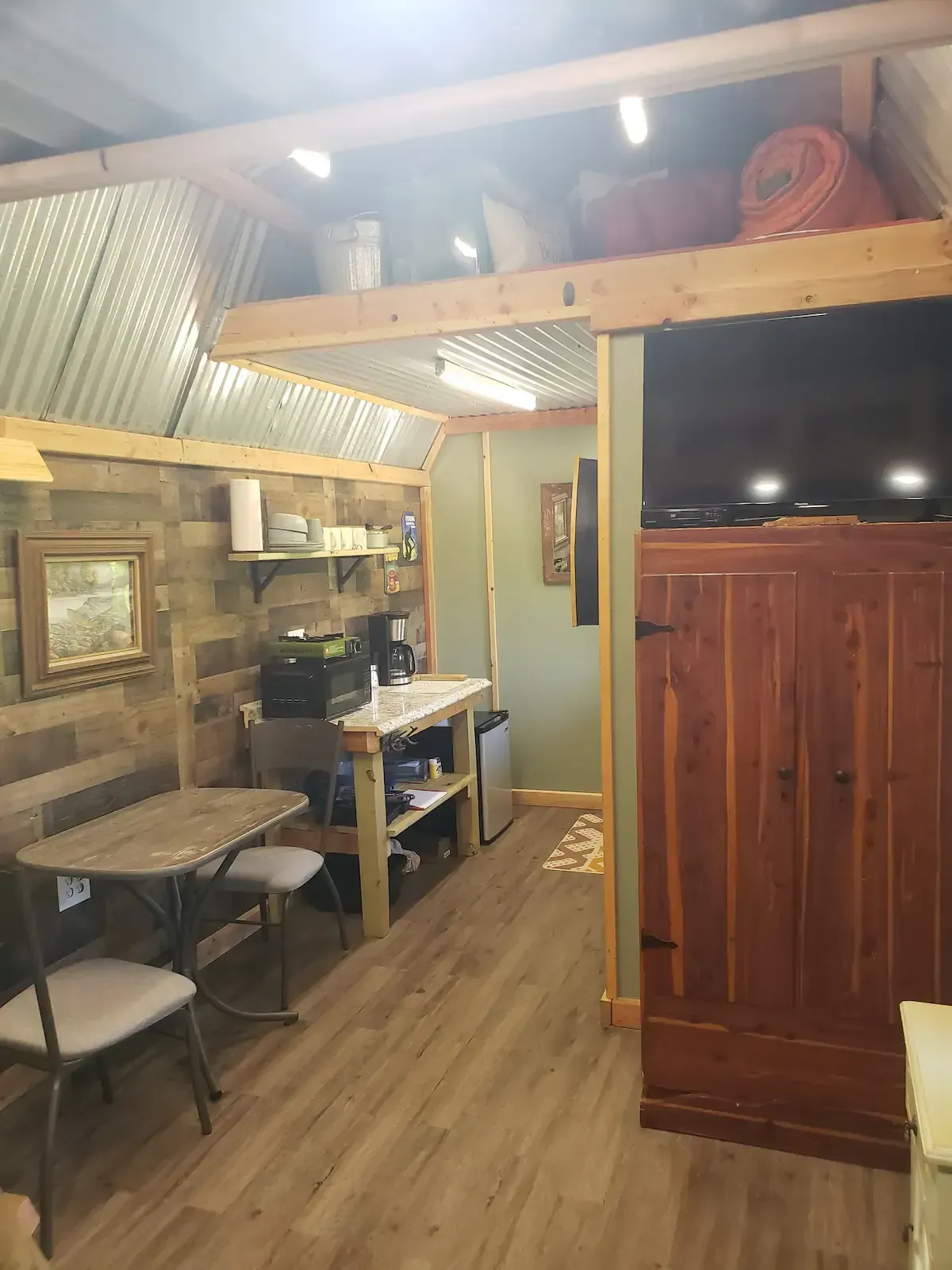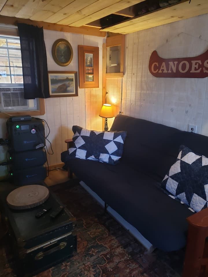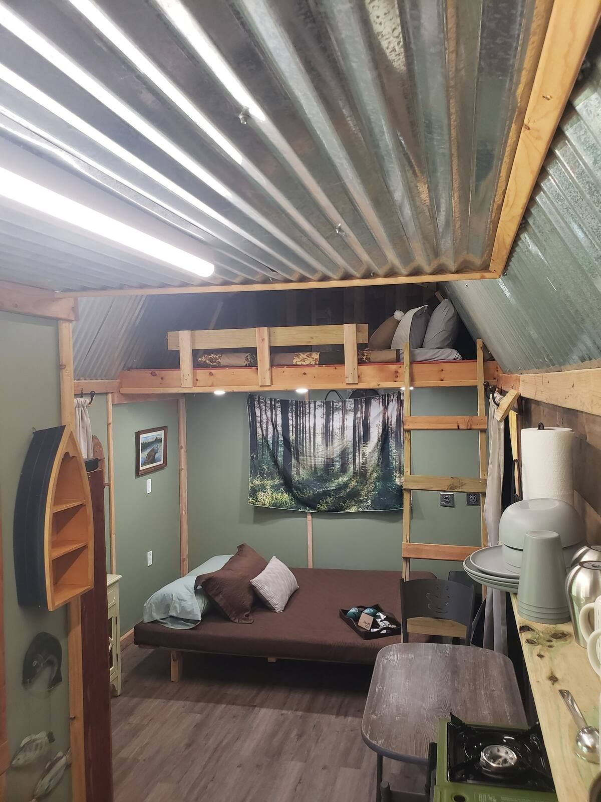 This completely off-grid tiny home has a queen futon with a twin bed in the loft. Kitchenette is stocked with a Keurig coffee maker, microwave, mini-fridge, Coleman single burner cook stove, cookware, cutting board, utensils, grilling utensils, plates, bowls, drinkware, towels & linens, 2 Adirondack chairs, picnic table, charcoal grill, gravity fed outdoor sink, firepit, solar powered, A/C, heated. Just steps away from the bathhouse with 2 private baths and a hot shower. Paddlers Rest is riverside with a great view.