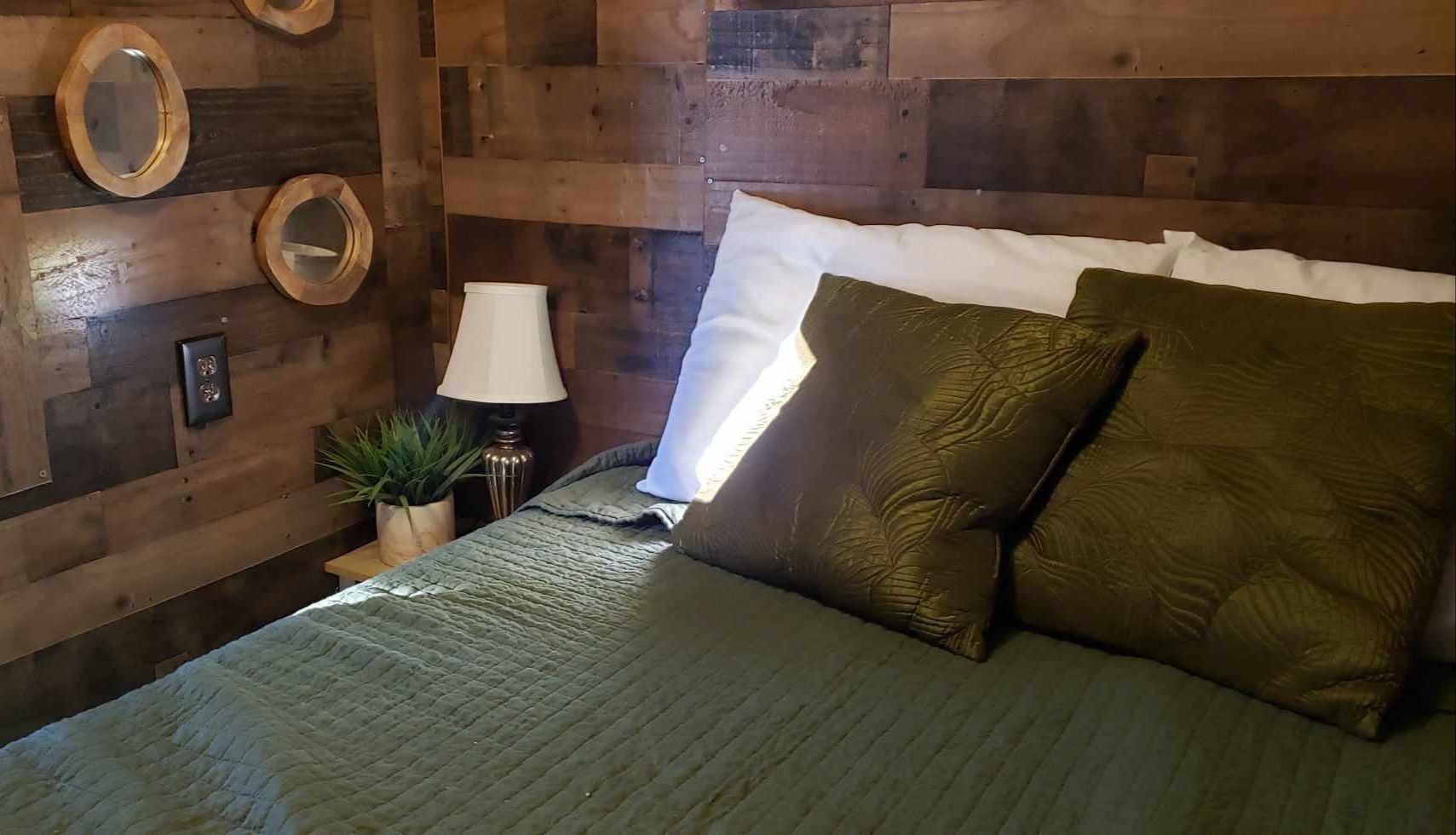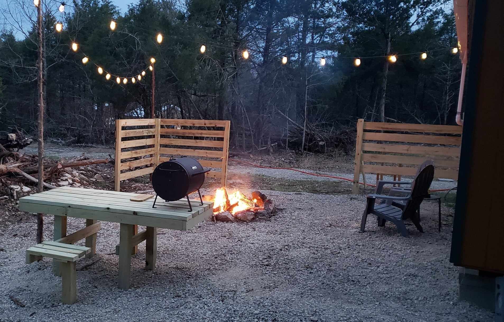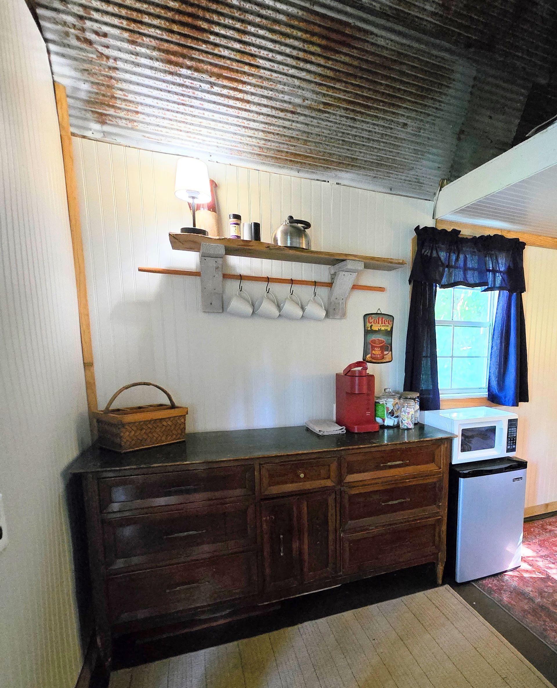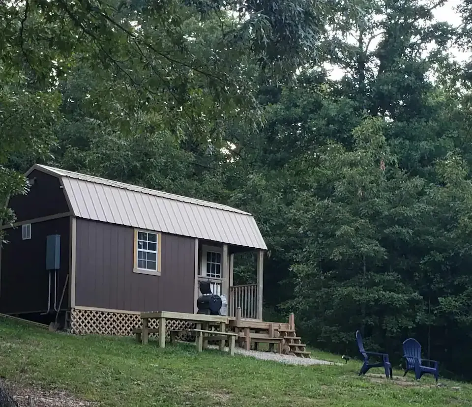 This completely off-grid tiny home has a queen futon with a twin bed in the loft. Kitchenette is stocked with a Keurig coffee maker, microwave, mini-fridge, Coleman single burner cook stove, cookware, cutting board, utensils, grilling utensils, plates, bowls, drinkware, towels & linens, 2 Adirondack chairs, picnic table, charcoal grill, gravity fed outdoor sink, firepit, solar powered, A/C, heated. Just steps away from the bathhouse with 2 private baths and a hot shower. Paddlers Rest is riverside with a great view.