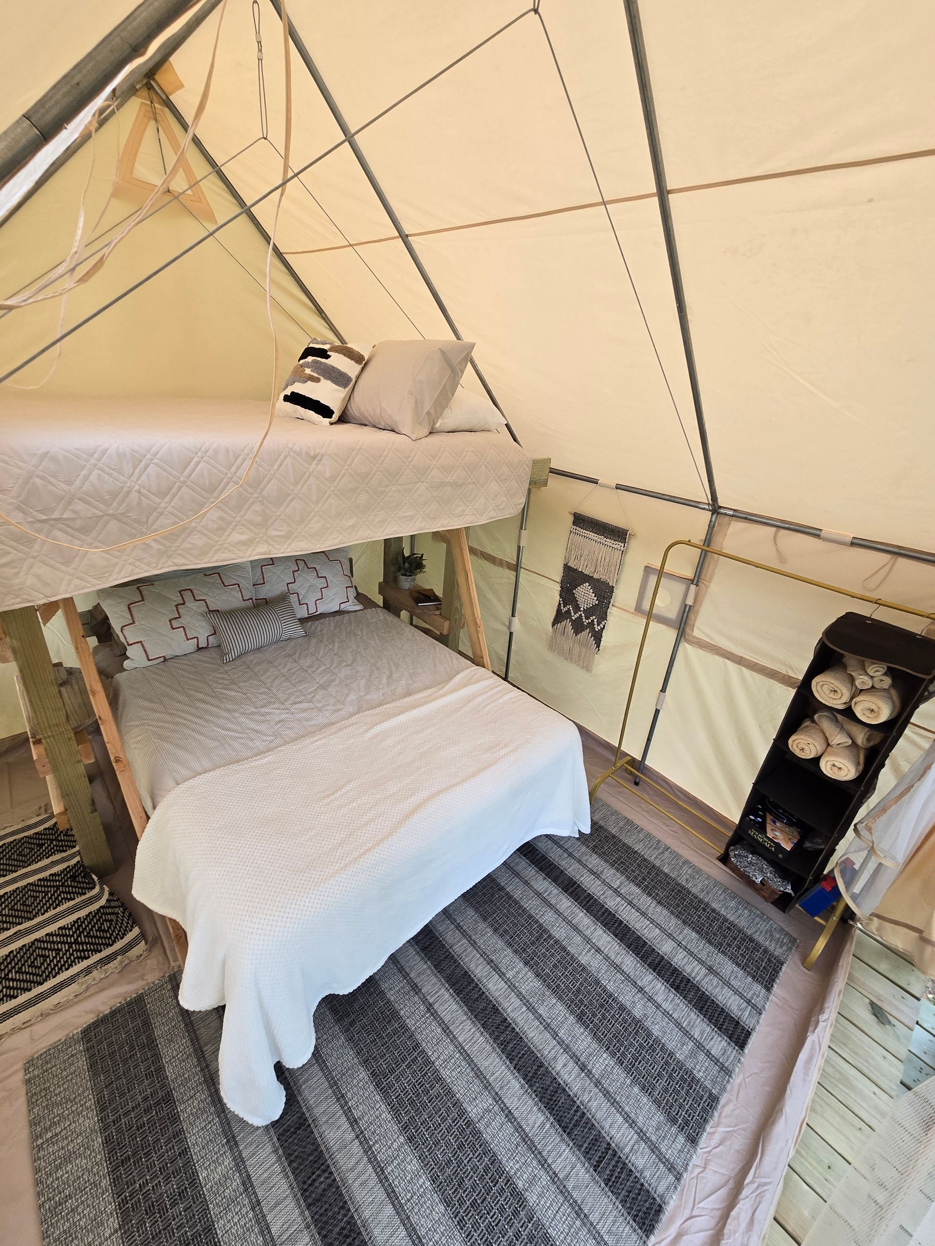 This canvas wall tent is located right on the river and is equipped with a queen size bed, and a full-size bunk bed, covered deck with cooking & grilling gear, charcoal grill, utensils, plates, bowls, drinkware, kettle, French press, single burner cook stove, gravity fed outdoor sink, fire pit & chairs, hammock, and picnic table. An off-grid bathhouse with 2 private baths is just steps away with a hot shower.