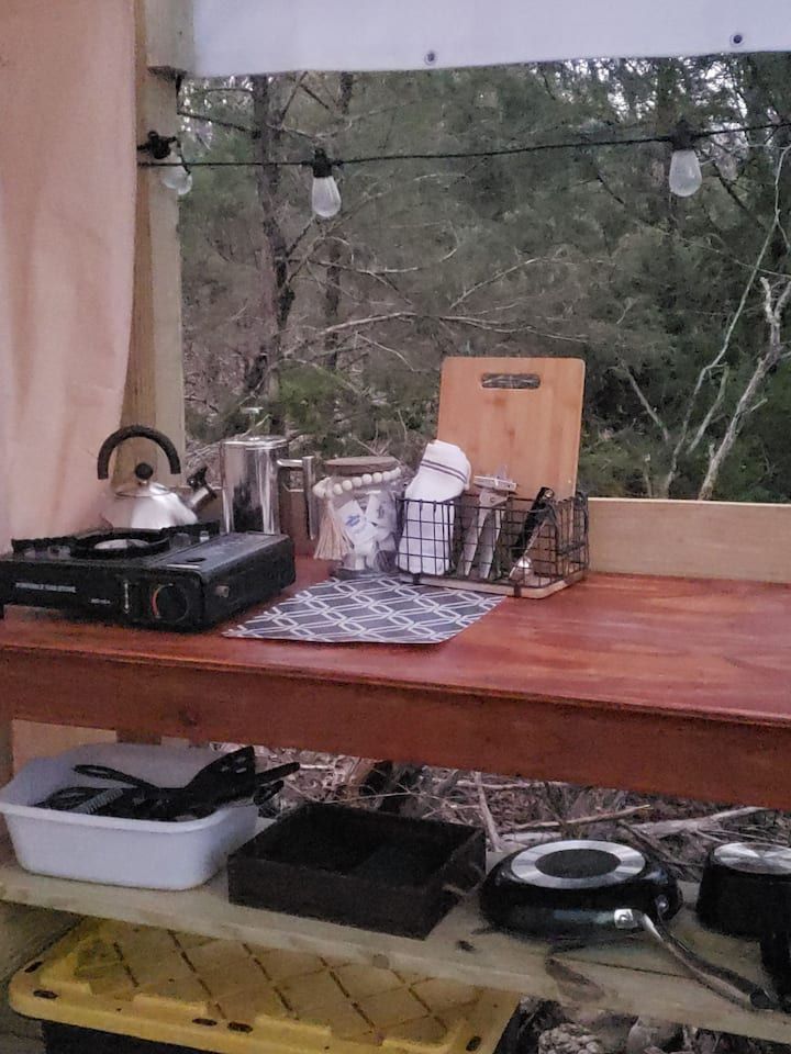 This dual canvas wall tent glampsite is secluded in the woods for a quiet and private glamping experience. Perfect for a family or a small group of friends. Both safari tents are each equipped with a covered deck, queen size bed, cot (if needed), outdoor kitchenette stocked with cooking & grilling gear, utensils, plates, bowls, drinkware, kettle, French press, single burner cook stove, gravity fed outdoor sink, fire pit & chairs, and two hammocks. Located at the top of the hill in the woods. The river can be accessed by walking trail or 4WD. An off-grid bathhouse with 2 private baths is just steps away with a hot shower.